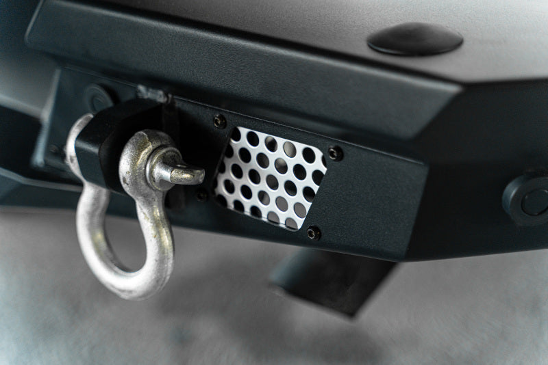 This Made To Overland Series Rear Bumper was designed for heavy off-road use, and is compatible with our TCJL-13 Bumper Mounted MTO Tire Carrier (Available December 2023). The bumper features a full-width design with tapered wings compatible with factory or aftermarket fenders. The OEM spare tire mount can fit up to a 37-inch spare tire. The MTO retains use of the factory hitch & harness, and features sensor cutouts to retain full functionality of parking sensors. Two 3-inch light pods can be mounted behind the perforated aluminum accent panels. The bumper also has (2) 1-inch thick clevis mounts compatible with ?-inch D-ring shackles. A license plate bracket with an included light relocates your license plate away from the spare tire area to keep it visible when running a spare. On the interior of the bumper are welded zip-tie tabs for clean wire management. This features a fully bolt-on installation with no modifications required.