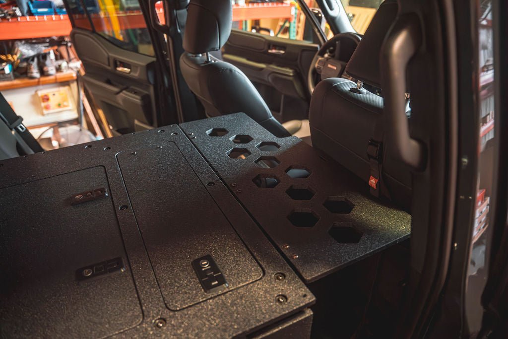 Brad's (@trailrecon) Favorite Package is a complete sleep and kitchen solution for your Land Cruiser 250 allowing for a single adult to sleep on the passenger side, lots of additional storage, a Dometic Coolmatic CD30 Fridge Drawer along with a mud room on the driver's side to allow for easy access and a convenient place to put your shoes, bags or even an additional strap down a fridge.