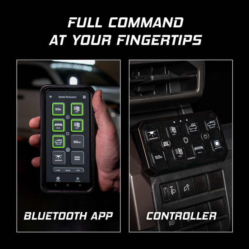Overview Upgrade your vehicles setup with the Diode Dynamics D-Switch! This advanced 8-channel switch panel gives you full control over any 12V accessory with four 30A and four 15A outputs, delivering serious power with unrivaled customization. Dedicated Backlight Channel. Unlike other 8-button controllers, the D-Switch includes a 9th button for the dedicated backlight bus bar, providing eight extra outputs for accent lighting. Activate all backlit accessories with a single press, freeing up main outputs for other functions. Dynamic Channel Assignment. Unlike one-to-one switch panels, the D-Switch allows multiple output channels per button, giving you complete control over your setup. You can also assign multiple functions of an output to different buttons, such as configuring one button for flashing and another for full power of the same light. Fast, Responsive Bluetooth App. Control and configure settings using the Bluetooth app for iOS and Android, which delivers instant response, no lag, and seamless programming. OEM Signal Integration. Three trigger wires are included to automatically activate your outputs with vehicle signals such as high beams, fog lights, or reverse lights. The ignition wire powers the controller when the vehicle starts, shutting it down automatically when turned off. The Night Mode wire adjusts output settings and controller brightness for low-light conditions. Solid-State, Durable Design. The D-Switch is built to withstand the toughest conditions, with a solid-state design and an IP67-rated aluminum heatsink for superior heat dissipation. No mechanical relays to wear out or physical fuses to replace! Whether for off-road lighting or other 12V accessories, the D-Switch offers unmatched power, customization, and reliability.
