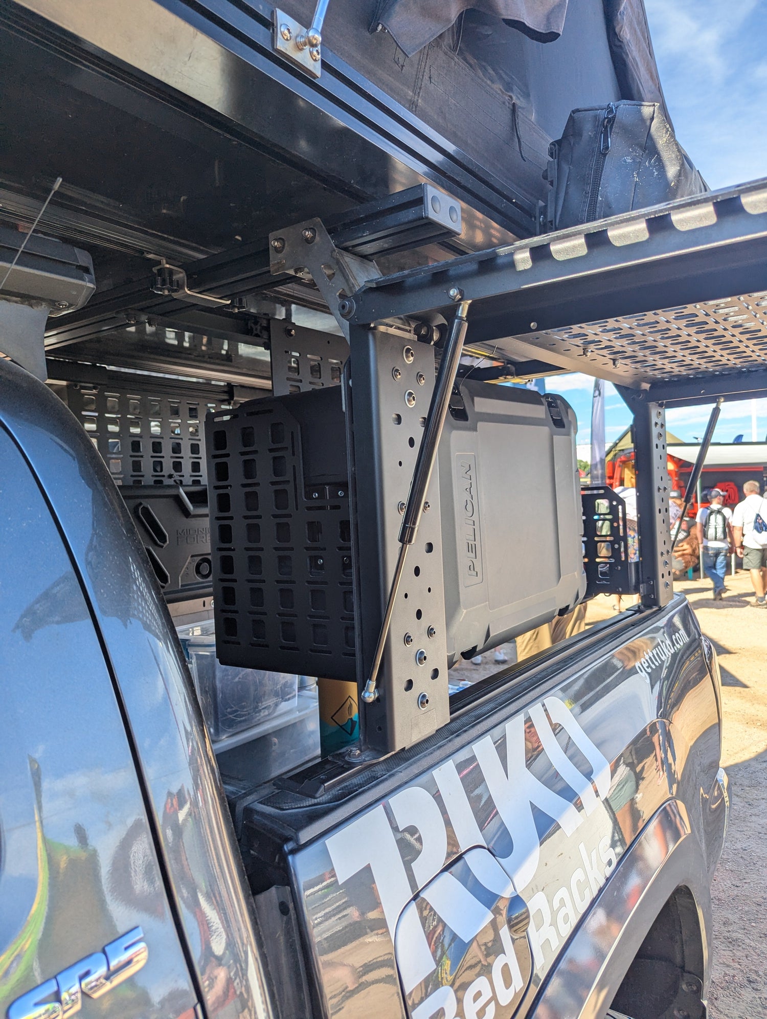 The MSP is available for 24" bed racks. This innovative new accessory from TRUKD allows you to mount jerry cans, Packout Boxes, and Pelican boxes (TX50 or TX80) to the side of your bed rack. Because the entire pod is covered in our unique hole pattern, it allows you to mount gear not only inside the pod but also on the outside of it. The front or back locations are great for fire extinguishers or medical kits. This pod is designed for the ultimate in flexibility!