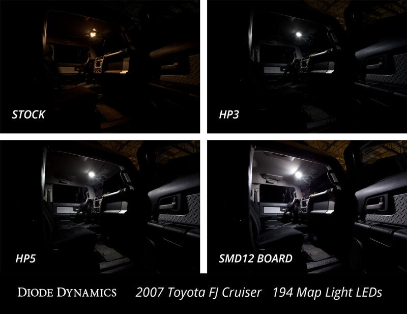Features Direct replacement for factory 74 194 BA9S or festoon-size incandescent bulb Increased output with LED Appearance Plug and play simple installation Available in multiple color options Overview Upgrade. Add more light output and a modern appearance to your vehicle with the SMD12 LED Board. With the included adapters the SMD12 is a direct replacement for any 74 194 BA9S or festoon-size incandescent bulb. Populated with 12 SMD chips arranged in a 4x3 matrix the total light output far exceeds the original bulb. Best of all installation only takes minutes - simply take out your factory bulb and the SMD12 will fit snugly in the socket. If you wish the SMD12 can be mounted to the inside of the factory housing using the 3M adhesive on the back of the board. Reliability. Unlike other bulbs on the market this bulb is built with constant-current circuitry along with transient suppression. That means this bulb will last for years not months with no flickering or failure. And like every Diode Dynamics product it's backed by an industry-leading three-year replacement warranty. Brightness. At 118 lumens the SMD12 will provide about triple the total light output compared to your factory bulb. All Diode Dynamics LED lighting is rated with accurate measured lumen figures not calculations or guesses. We test the true output in-house and provide you the real numbers to compare. Colors. The SMD12 is available in 6000K cool white red blue and green. Whether you want a modern cool white appearance or want a change of color to match your unique style we have the color to fit your need!