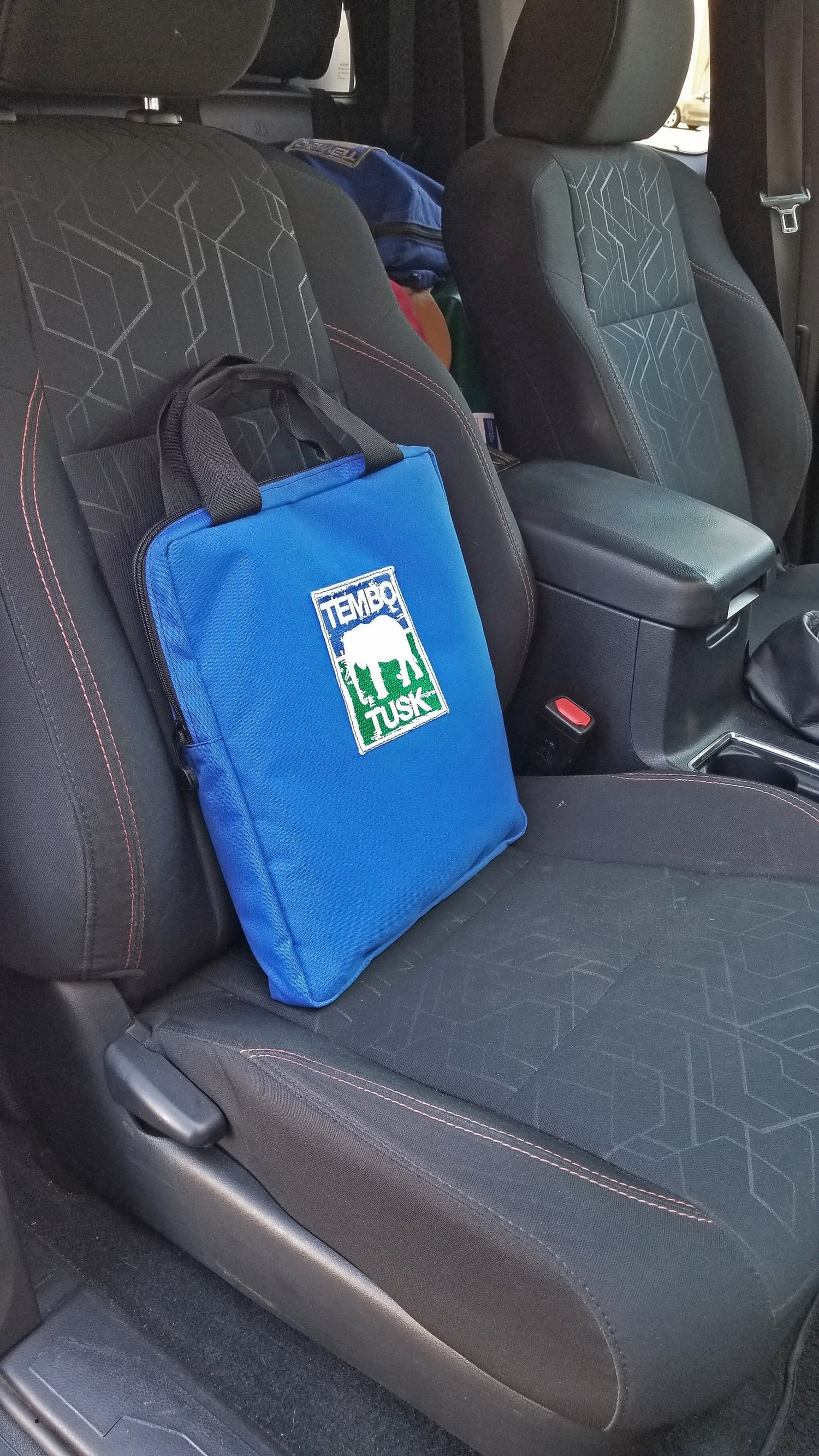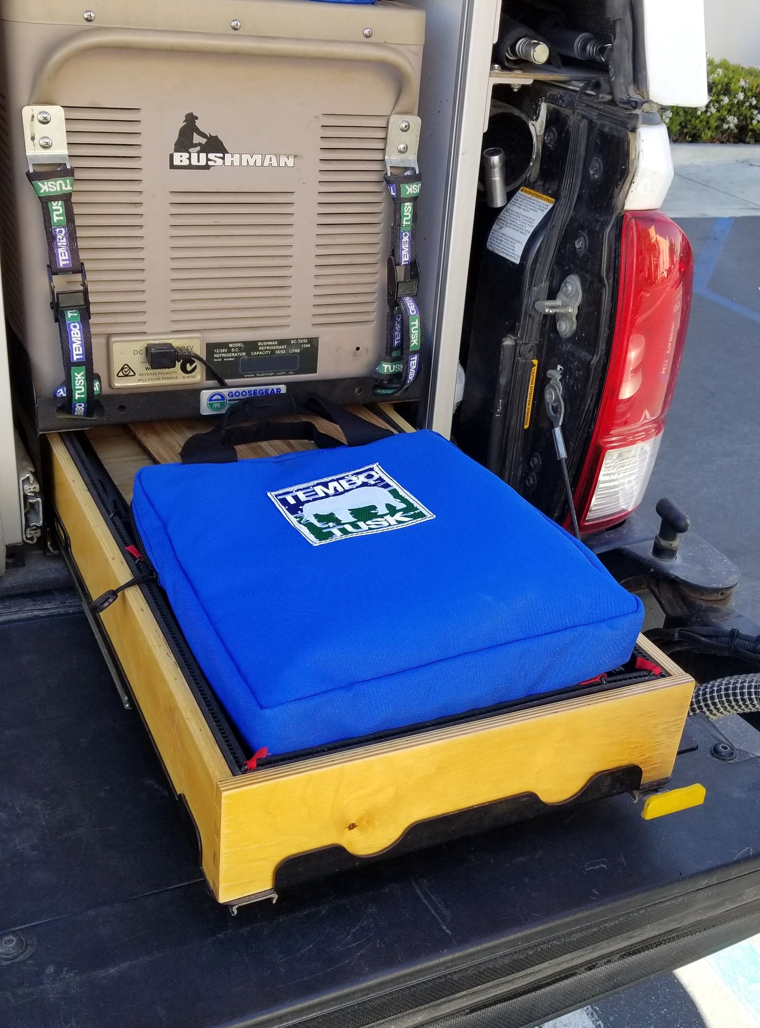 The Carry Bag is made from an extremely durable dual layer heavy weight material with padding to protect both the Fire Pit and the vehicle it is stored in. Marine grade thread is used for rough outdoor environments and the bag comes with a sturdy handle for transport. The closures are YKK zippers. The fire pit carry bag has two internal sections; one for the stainless steel fire pit parts and the other for the propane hose. The Bag is 12.5" x 14" x 2" , so it can fit in a storage drawer, AluBox, Front Runner Wolf Pack or behind your seat in the vehicle. The TemboTusk Fire Pit takes very little room for storage.