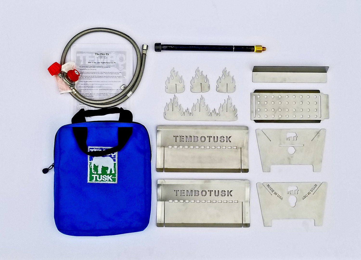 The Fire Pit by TemboTusk is made from Stainless Steel and is designed to be used as a propane fire pit only. The Kit includes the flat pack fire pit, a 20,000 BTU burner, a 4' stainless steel braided or rubber propane hose with regulator and a high quality carry bag.
